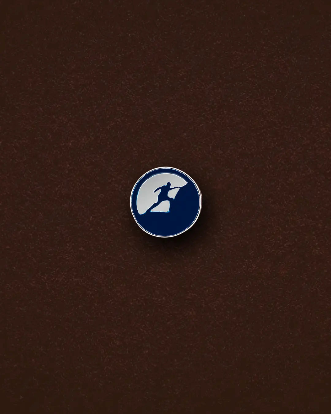 This circular sterling silver and enamel detailed pendant represents the goal of hiking or climbing a mountain.