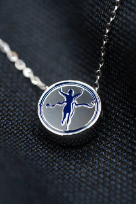 This circular sterling silver and enamel detailed pendant represents the goal of surfing.